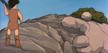 Horus, jeune garçon courageux, affronte seul une meute de loups. Au cours du combat, il perd sa hache. Trouvant refuge sur une roche et alors que la situation semble désespérée pour lui, le sol se soulève et laisse émerger de sous terre Mogue, le géant de pierre, qui met en fuite les loups.