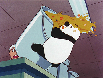 La petite fille demande à Pandy de l’attendre dehors et revient en classe. Mais le petit panda est très vite attiré par les odeurs de la cantine et en cherchant à voler de la nourriture, il provoque une véritable panique dans les cuisines. C’est recouvert de soupe qu’il s’enfuit poursuivi par le personnel de l’établissement et bientôt tous les élèves de l’école. Heureusement, Mimiko parvient à l’attraper et le nettoyer avant que ses poursuivants ne découvrent que l’ours qu’il croyaient poursuivre était la peluche panda de Mimiko !